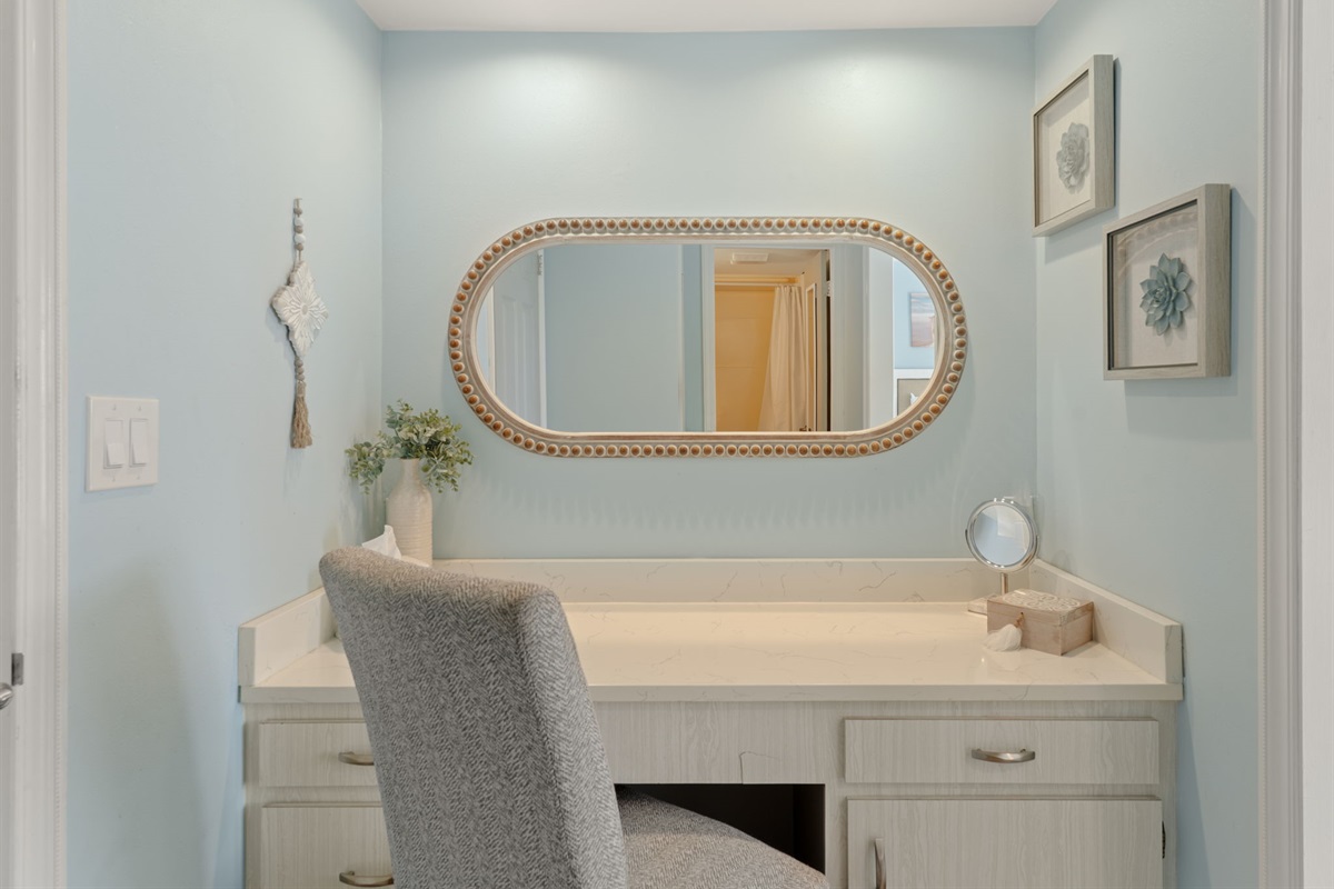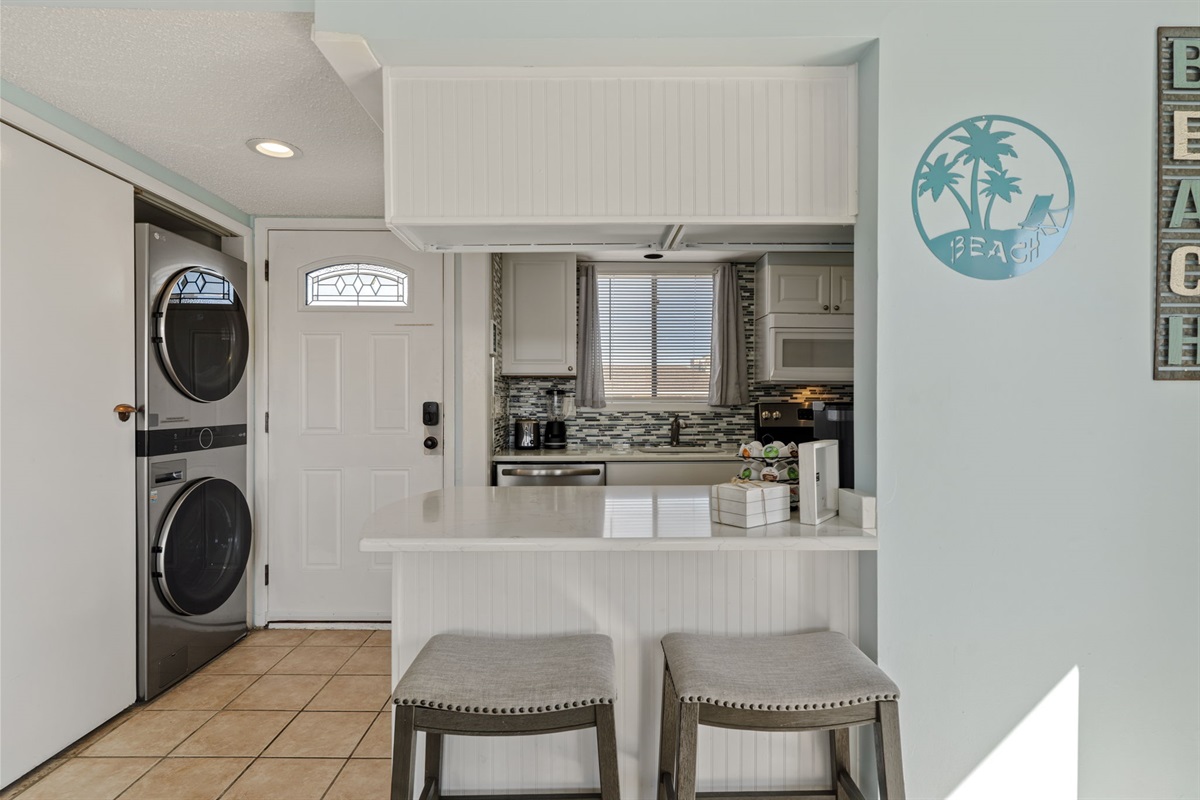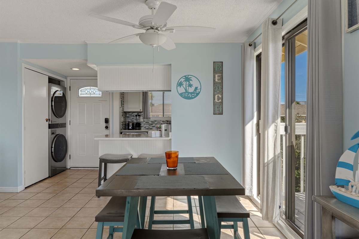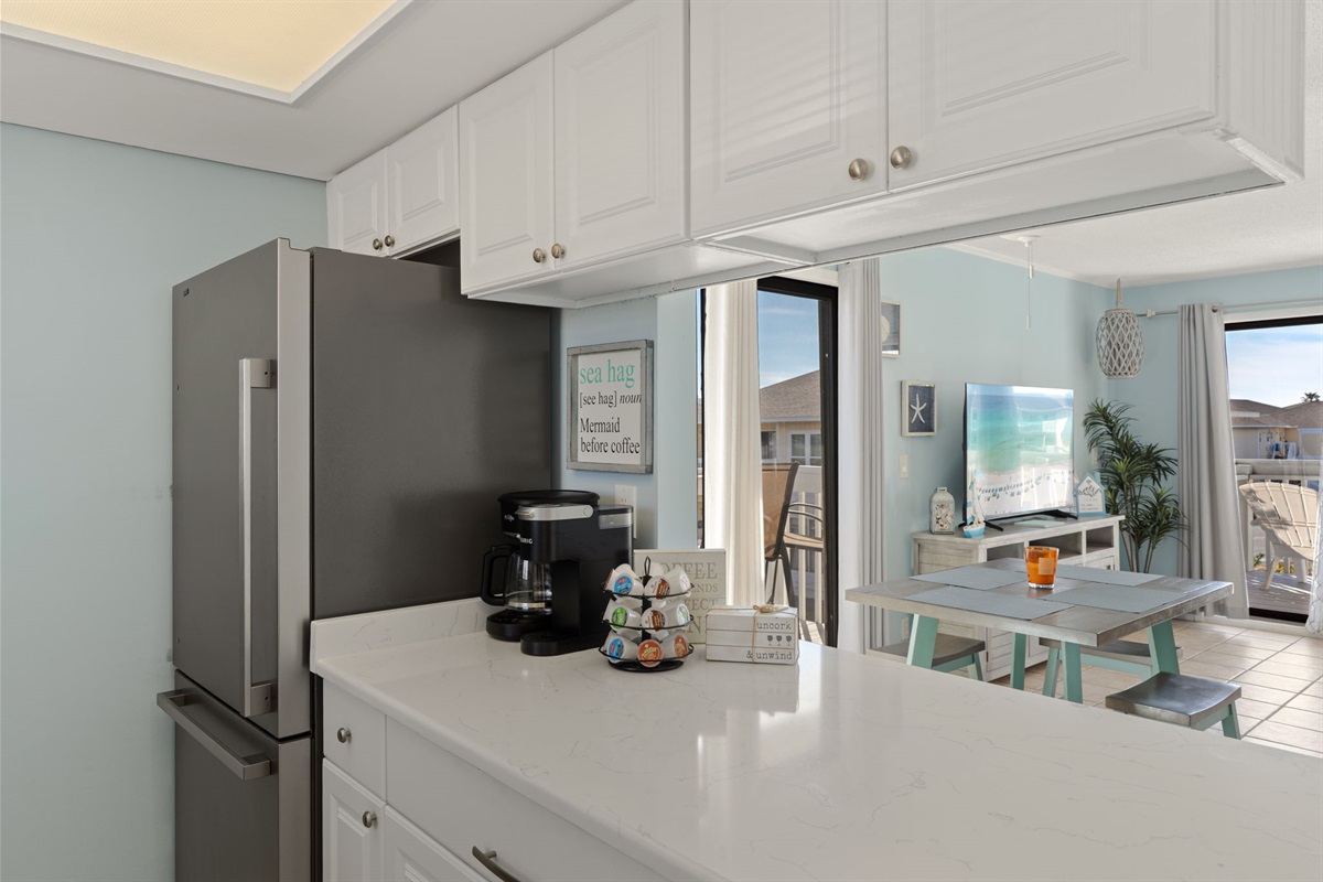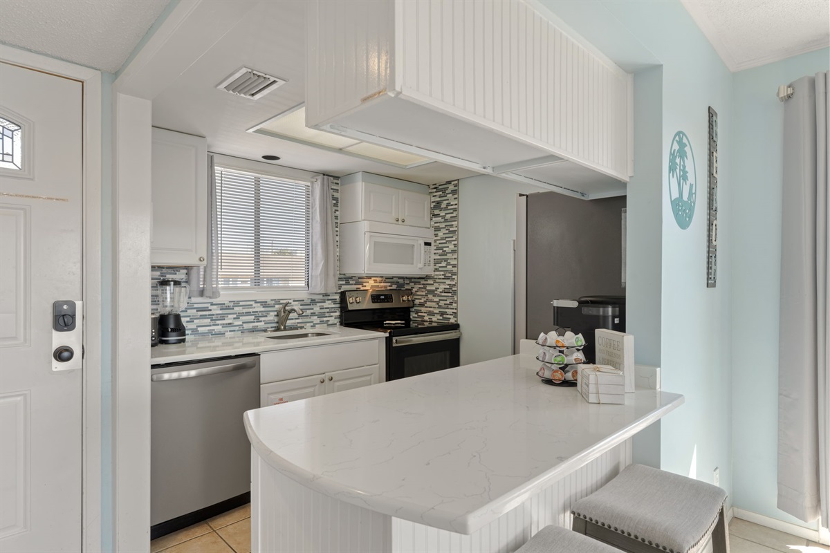 The updated kitchen offers a fully stocked cooking setup and a drip coffee maker to start your mornings right. Whether you're preparing beach-day snacks or a full dinner, you'll have everything you need.
